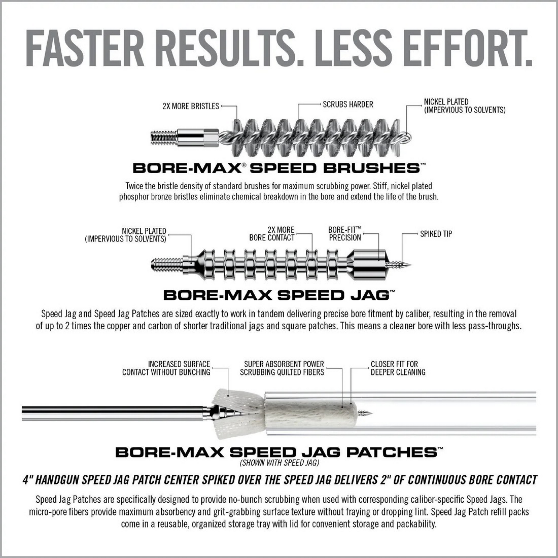 Das Real Avid Bore-Max Speed Clean Upgrade Kitist eine Erweiterung der Produktreihe Bore-Max Speed, bestehend aus einem Putzstock mit ergnomisch geformten Griff und den dazu passenden Reinigungsbürsten. Das Upgrade Kit enthält 2 verschiedene Reinigungsbürsten und 75 Reinigungspatches. Optimal an die Größe des Kalibers angepasst, ermöglichen sie maximale Reinigung. Die Bürste weist eine höhere Borstendichte als andere Reinigungsbürsten auf. Die Patches sind im gegensatz zu anderen sehr viel länger. Dadurch erreicht man eine größere Reinigungswirkung, da sich das Patch um die gesamte Länge der Bürste legt und nicht nur um die Spitze.